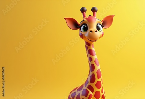 Cute smiling giraffe cartoon character isolated on yellow background with copy space, wild animal character concept