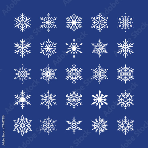 Cute snowflakes collection isolated on blue background. Flat snow icons, snow flakes silhouette. Nice element for christmas banner, cards. New year ornament. Organic and geometric snowflake set.