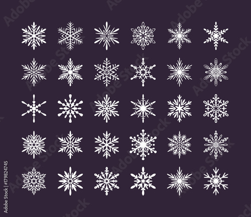 Cute snowflakes collection isolated on dark background. Flat snow icons, snow flakes silhouette. Nice element for christmas banner, cards. New year ornament. Organic and geometric snowflake set.