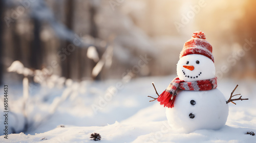 Cute snowman in a cap and scarf in winter snow scene background, celebration concept