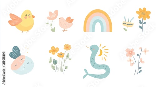 Cute spring animals and flowers; pastel rainbow background; kids' illustrations