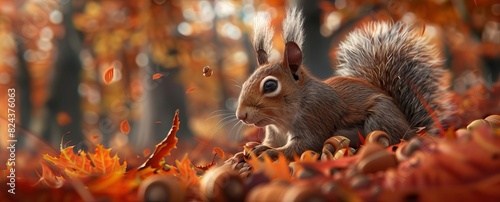 Cute squirrel gathering acorns in a colorful autumn forest, surrounded by vibrant orange leaves.