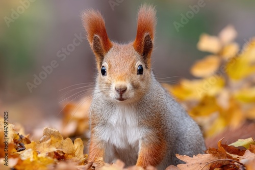 Cute Squirrel Portrait in Autumn Leaves