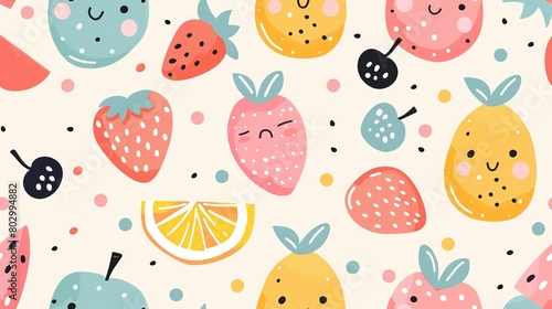 cute strawberry lemon fruit seamless pattern nursery design cartoon style illustration with grungy texture, Generative Ai