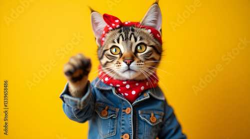Cute Tabby Kitten Portrait in Denim Jacket and Red Bandana Headband on Yellow Background Pet Fashion