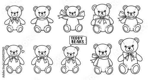 Cute teddy bear icons in black and white, hand-drawn style with ribbons and soft shapes.