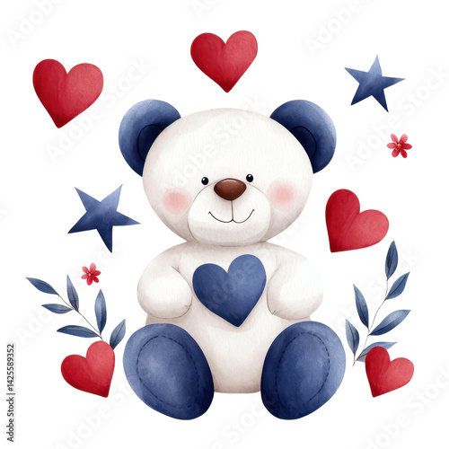 Cute teddy bear illustration surrounded by hearts and stars. isolated against a transparent background.