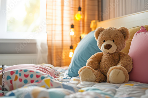 Cute teddy bear sitting on a bed in child's room. Soft stuffed animal surrounded with colorful pillows in children's cozy space.