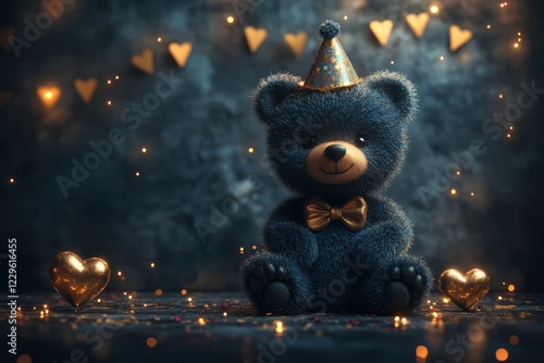 Cute teddy bear with a party hat surrounded by hearts and sparkles in a cozy atmosphere.
