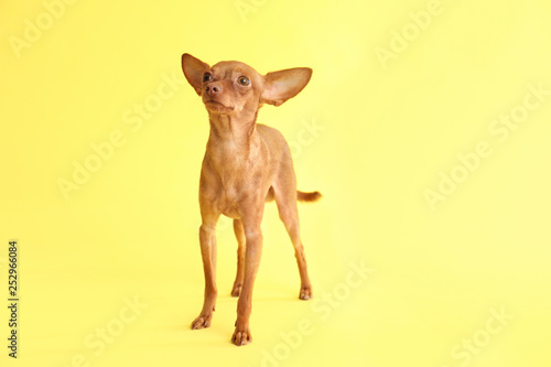 Cute toy terrier on color background, space for text. Domestic dog