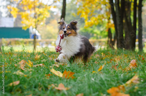 Cute tricolor dog sheltie breed is running and bringing a toy rope in fall park. Young shetland sheepdog is playing on green grass and yellow or orange autumn leaves