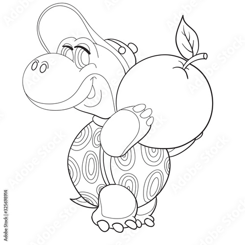 cute turtle character holds big apple in its paws, outline drawing, isolated object on white background,