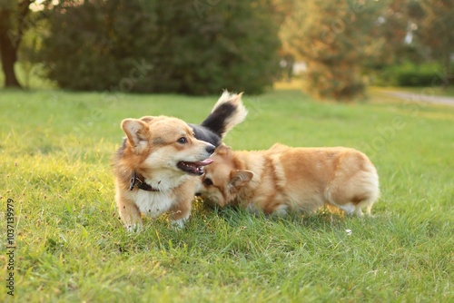 cute two welsh corgis enjoying a walk in the park at sunset