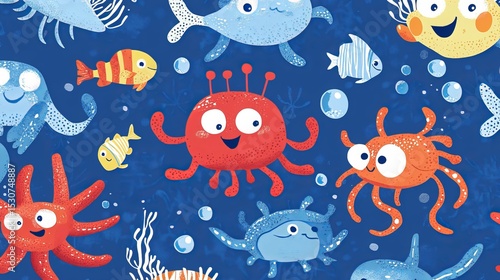 Cute underwater creatures in a seamless pattern, ideal for children's products. Great for bedding, fabric, wallpaper, gift wrap, and apparel.