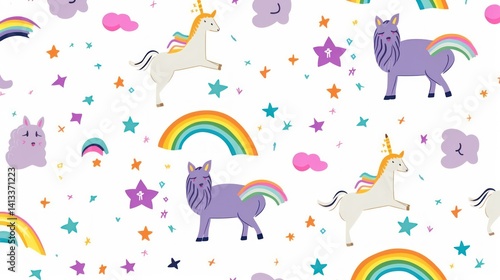 Cute Unicorns and Rainbows Pattern on White Background for Children