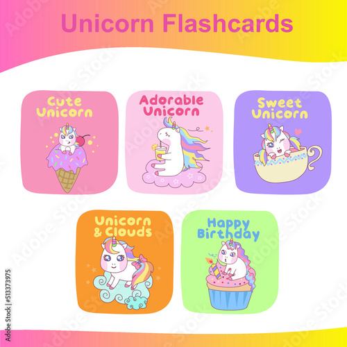Cute unicorns collection flashcards. Printable game cards. Vector illustration.