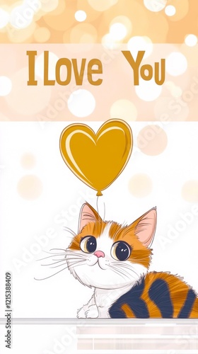 Cute Valentine card in kawaii style. Lovely cat with balloon in heart shape and gift box with Inscription I Love you.