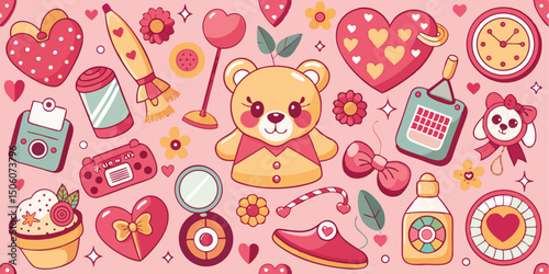 Cute valentines day seamless pattern with sweet love items on a pink background