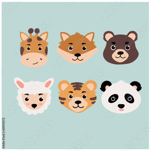 Cute vector animals group giraffe bear sheep tiger heads illustration