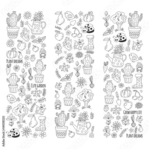 Cute vector garden with birds, cactus, plants, fruits, berries, gardening tools, rubberboots Garden market pattern in doodle style for coloring pages, coloring books