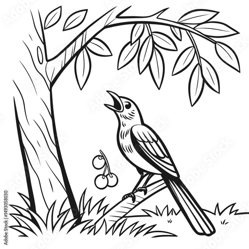 Cute vector illustration of a bird on a spring branch with leaves and flowers