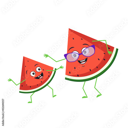 Cute watermelon characters with emotions, face. Funny grandmother with glasses and dancing grandson with arms and legs. The happy hero, berry or fruit