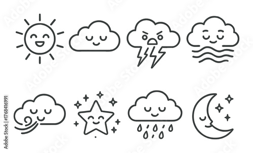 Cute weather icons: sun, clouds, storm, wind, star, moon illustrations