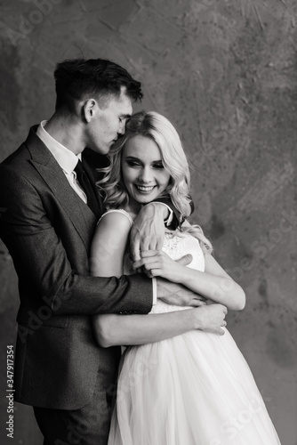 Cute wedding couple in the interior of a classic studio decorated. They kiss and hug each other.