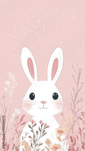 Cute white bunny hiding in flowers on pink background