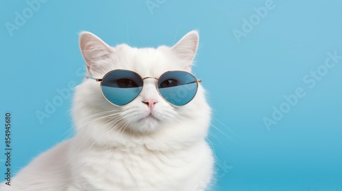Cute white cat wearing sunglasses on blue background. Copy space.
