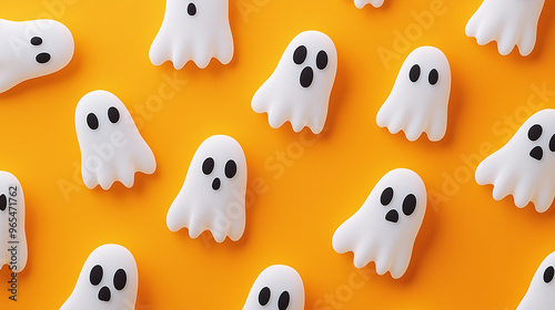 Cute white ghosts flying on yellow background. Halloween Concept.