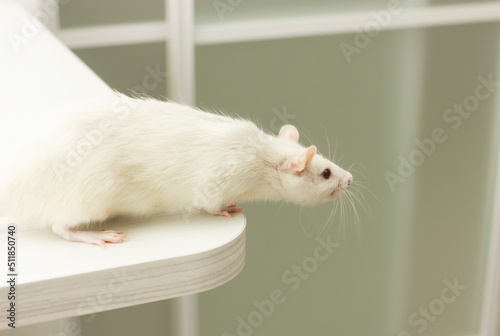 Cute white lab rodent (rat, hamster, pet) sitting on the table, sniffing, copy space, close up, white background. Laboratory. Veterinary clinic. Retail. Zoo market. Horizontal plane.