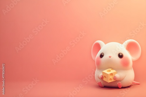 Cute White Mouse Toy Holding Yellow Cheese Figurine on Pink Background