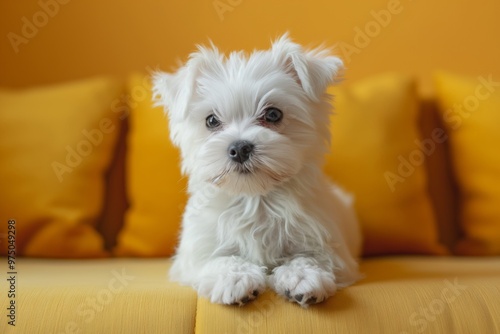Cute white puppy with fluffy fur sitting on yellow couch, creating a warm and cozy domestic scene.