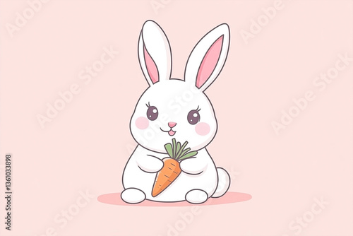 Cute white rabbit holding an orange carrot in a simple flat line illustration with a pink background