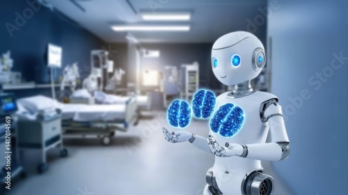 Cute white robot holding three glowing digital brains shows ai intelligence in surgical robotics, robotic surgery innovation, and smart ai healthcare tools