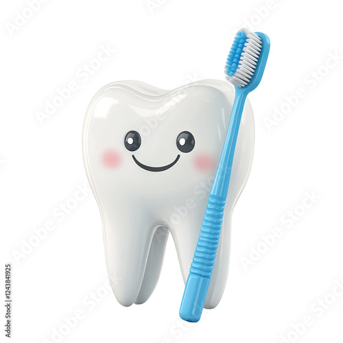 Cute white tooth character with a happy face and blue toothbrush, isolated on transparent cutout background