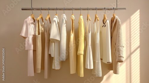 Cute Women's Clothes Hanging in Closet with Light Beige and White Colors – Modern Minimalist Home Decor Closet Room