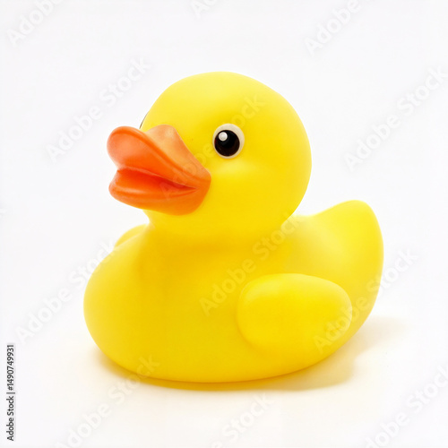 Cute yellow rubber duck toy with an orange beak and big eyes, placed on a white background, commonly used for baby baths or playtime.