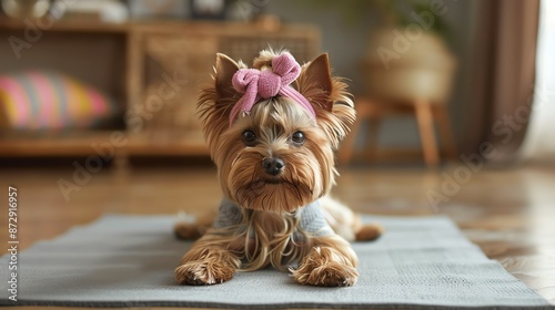 Cute Yorkshire Terrier puppy wearing a pink bow and grey sweater.