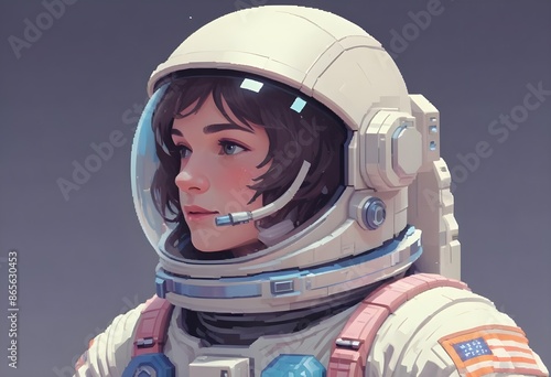 Cute young female astronaute looking at the distance in the sky, glimsping, beautiful night sky behind with planets and stars, pixelart comic
