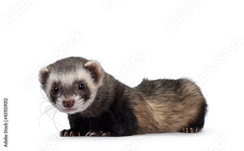 Cute young ferret laying down side ways, looking to camera. Isolated on a white background.