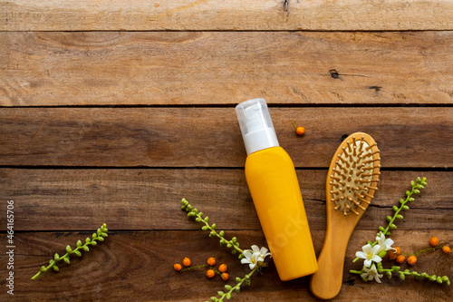 cuticle professional hair care serum for damaged hairs with comb health care beauty head and hairs of lifestyle woman arrangement flat lay style on background white wooden