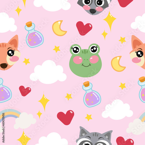 Cutie pink pastel seamless pattern with forest kawaii animals for children's nursery