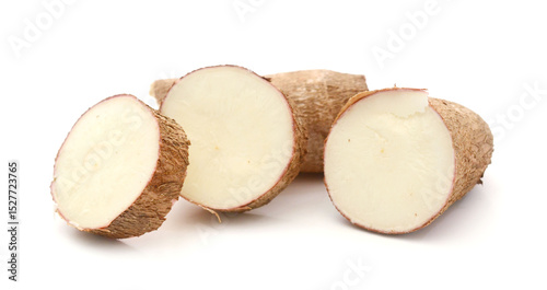 Cutting and whole manioc (cassava) isolated on white background.