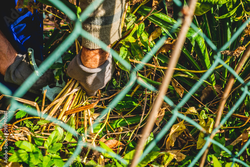 Cutting branches and pruning withered plants. The concept of cleaning and caring for the garden. The man pruns the branches, removes withered plants. Autumn cleaning before winter, spring cleaning.