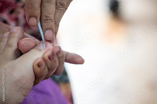 Cutting cuticle during manicure procedure in the beauty salon.Nail cleaning in the beauty salon. Beautician performs pedicure, cleans and cuts fingernails at the feet