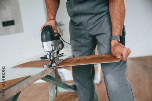 Cutting the planks. Man is installing new laminated wooden floor