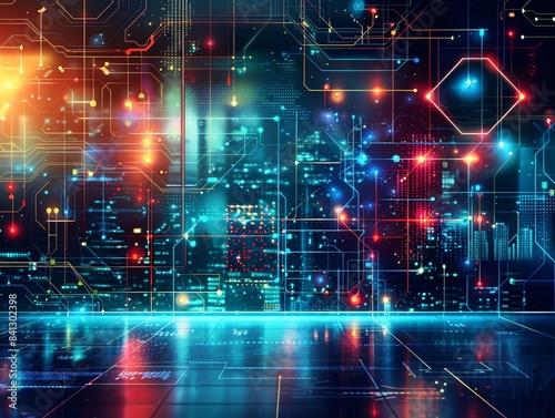 Cutting-edge office interior with cyberpunk design, neon accents, and IT overlays, blurred background