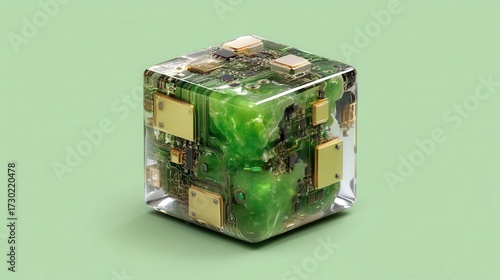 cyber monday Futuristic cube with circuit design and green elements.